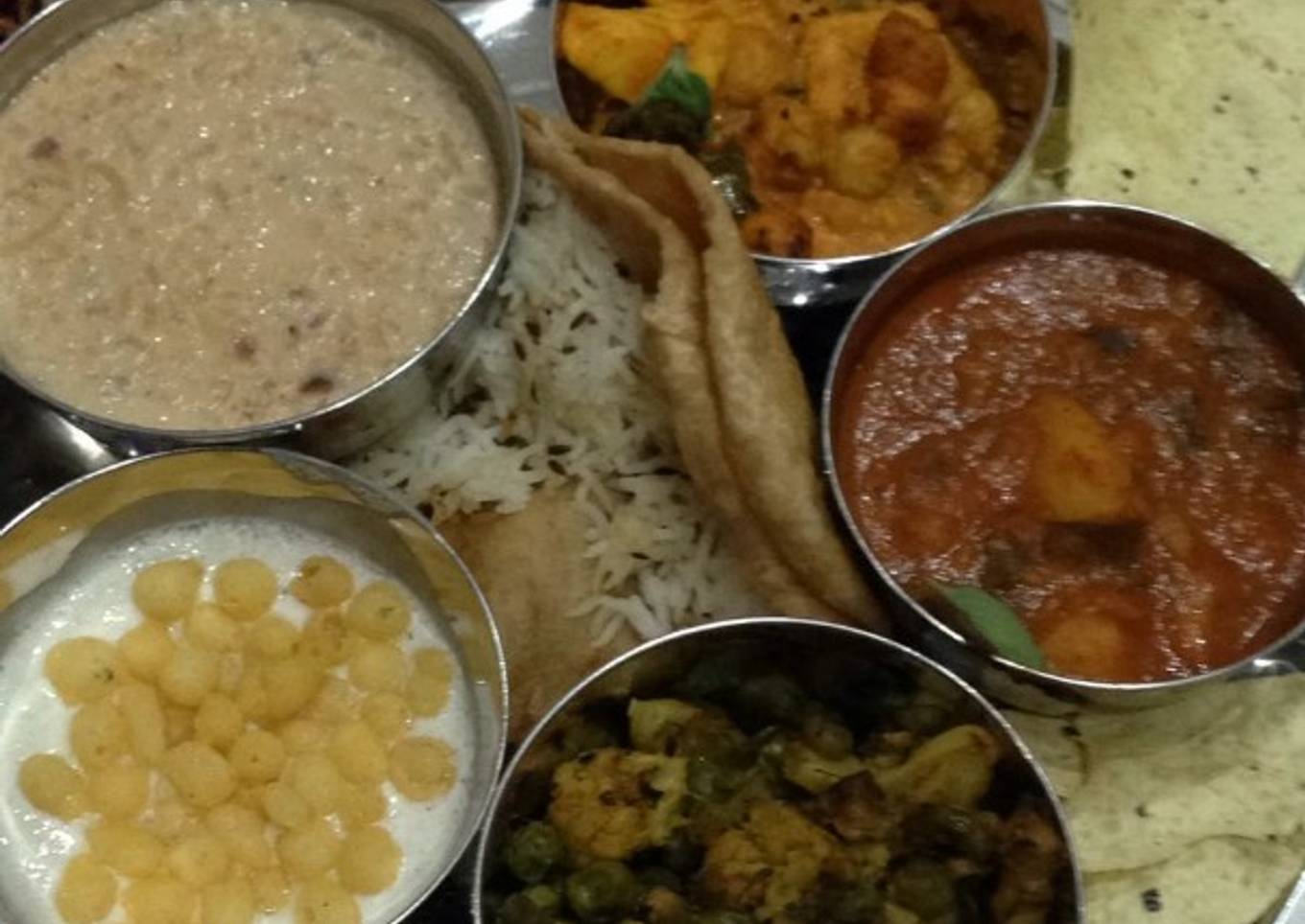 Paneer makhana, aloo tamatar, aloo matar gobhi, kheer, boondi rayta, puri, jeera rice and papad