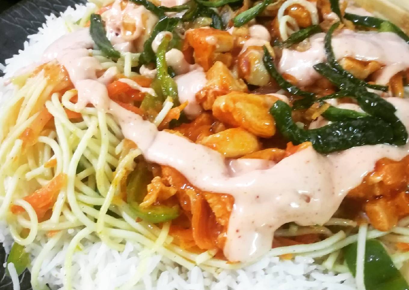 - Now for baghar in a pan add oil garlic cloves and green chilli until turn brown.keep aside. Now first in a serving dish add rice then spaghetti then chicken gravy then sauce and baghar and enjoy yummiest rice