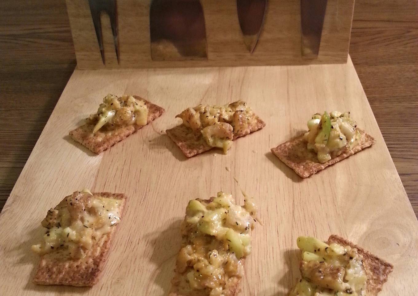 - In small bowl, mix fish, cucumber, sriracha mayo, sour cream, steak sauce, salt, dillweed,pepper and red pepper sauce. Spread about 1 heaping teaspoonful of mixture on each cracker. Place crackers on baking sheet.
